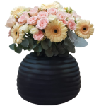 Noir Elegance is a graceful floral arrangement that brings together soft blush roses, creamy gerberas, and delicate eucalyptus in a bold, textured black vase. The contrast between the deep noir base and the pastel petals creates a timeless statement of sophistication and charm. Perfect for gifting or elevating your home décor with refined elegance.